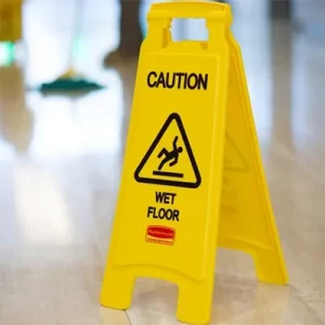 – Thông báo cảnh báo “Cẩn thận sàn ướt” được in bằng tiếng Anh