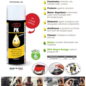 – Dầu bôi trơn tẩy rỉ sét PK là dạng dầu cao cấp theo tiêu chuẩn Châu Âu với nguyên liệu 80% xanh và sạch, thân thiện với môi trường