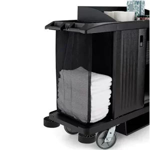 Tăng dung lượng chứa khăn trải giường mà không cần tăng kích thước xe đẩy với túi đựng khăn trải giường lưới Rubbermaid® 1966889 Executive 25 gallon, kiểu mở từ bên hông. Túi đựng khăn trải giường này được thiết kế để giảm số lần đi đến tủ đựng khăn trải giường, đồng thời bảo vệ mặt bên của xe đẩy khỏi trọng lượng tăng thêm do việc đặt khăn trải giường trực tiếp lên mặt bên. Sử dụng túi này với xe đẩy dọn phòng tương thích (bán riêng) để phục vụ khăn trải giường nhanh chóng tại khách sạn, nhà nghỉ hoặc nhà trọ của bạn. 6 lỗ móc ở phía trên túi cho phép túi phù hợp với hầu hết các xe đẩy, đảm bảo tích hợp liền mạch vào dịch vụ dọn phòng hiện có của bạn.