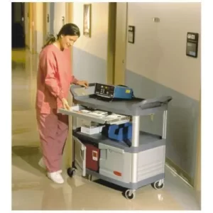 – Hành lang: Xe đẩy phục vụ 2 tầng có ngăn kéo và tủ màu xám giúp dễ dàng di chuyển qua các lối đi hẹp trong khách sạn hoặc văn phòng.